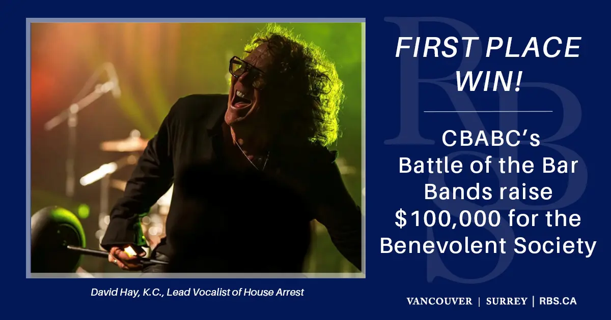 First Place for David Hay, K.C., President of CBABC’s Benevolent Society, and House Arrest at Vancouver’s Battle of the Bar Bands – Over $100,000 Raised!