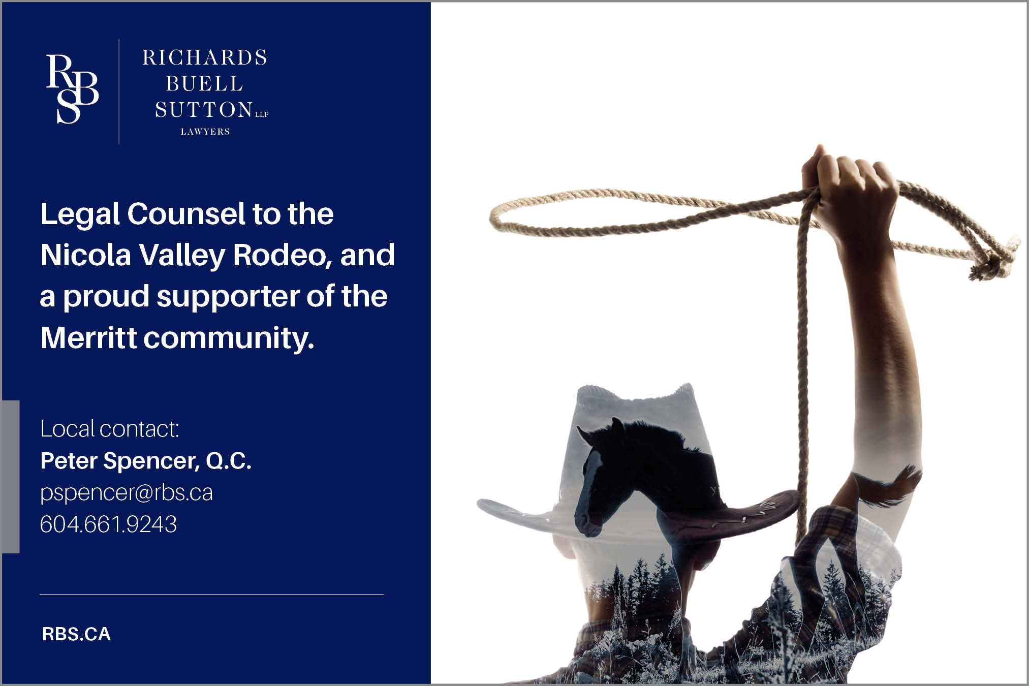 RBS is the legal counsel to the Nicola Valley Rodeo and a proud supporter of the Merritt community. We are delighted to once again sponsor this signature event taking place this September long weekend. The Nicole Valley Rodeo Association (NVRA) is dedicated to preserving the western culture, and celebrates the strong history the community has in ranching, rodeo and equine. To learn more about NVRA, click here.