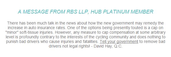 Bike Lawyer, David Hay, Q.C., has an opinion on approaches the new government could take for increases in auto insurance rates. Read more below. To learn more about HUB or to sign up for HUB’s newsletter and receive cycling news and events in Metro Vancouver, click here.