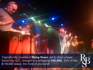 The Tragically Hip cover-band, Rising Down, led by Bike Lawyer David Hay K.C., brought in $40,000 which was 23% of the total $176,000 raised, placing them 1st among participating bands.