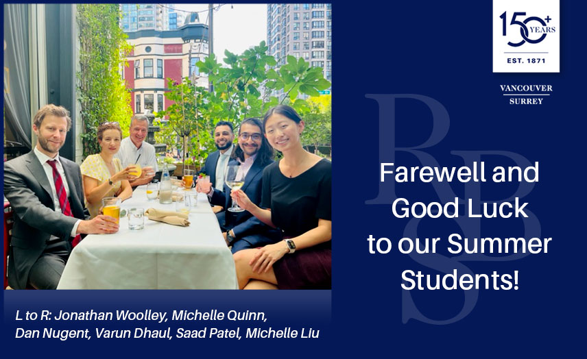 Summer Students Varun Dhaul, Michelle Liu and Saad Patel have finished Summer Articles with us and are returning to University to finish their law degrees. From each of their principals who’ve provided mentorship along the way including Jonathan Woolley, Michelle Quinn, and Dan Nugent, thank you for your hard work, collegiality and collaboration!