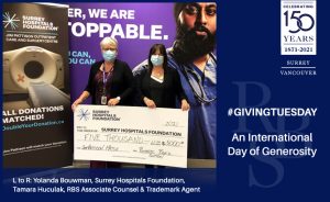 RBS Surrey Lawyer and Trademark Agent, Tamara Huculak, presents this year’s gift to Surrey Hospitals Foundation in support of their drive to purchase new equipment for the Breast Health Surgery program at the Jim Pattison Outpatient Care and Surgery Centre. On this international day of giving, our firm proudly supports this cause.