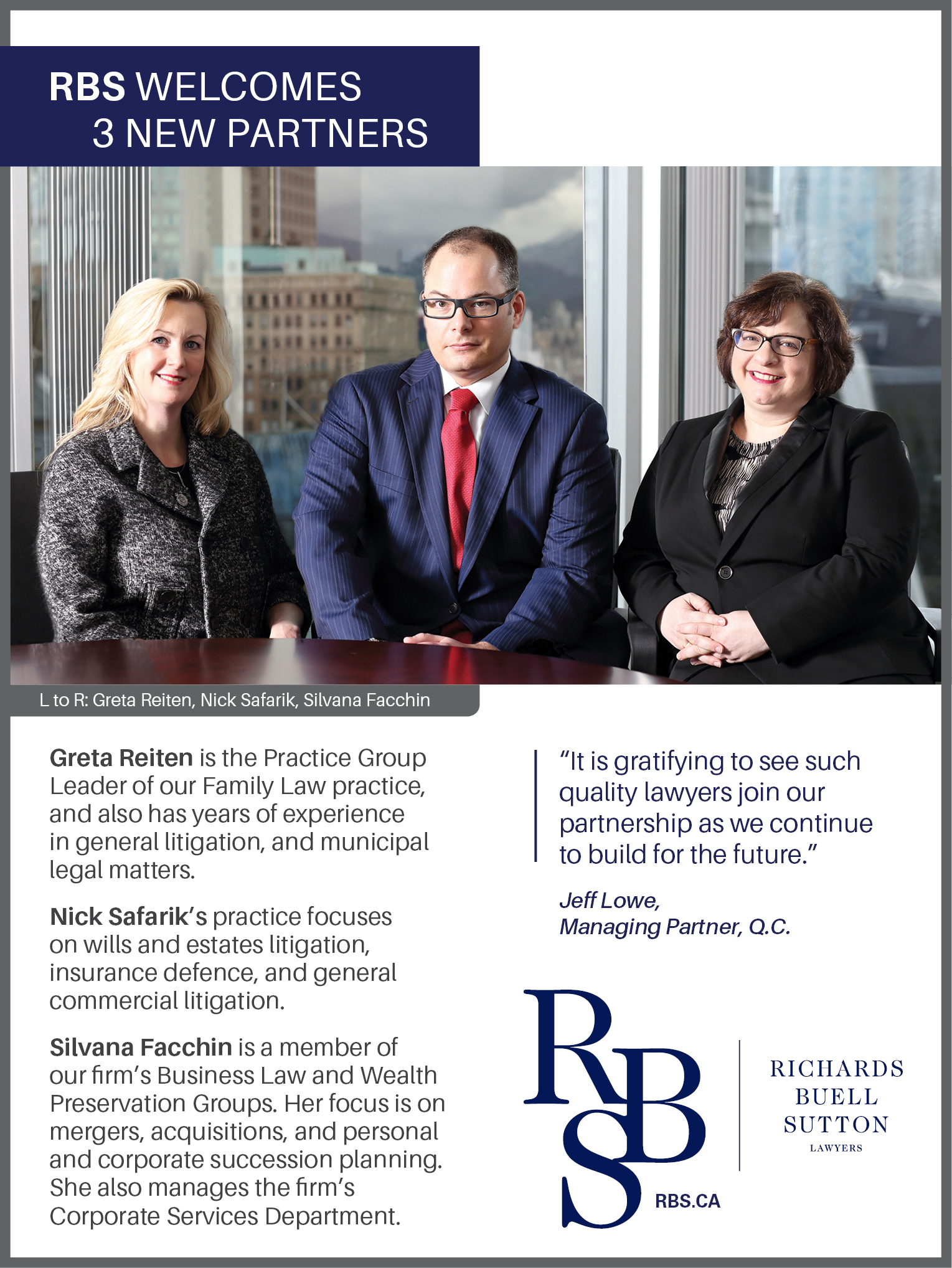 We are pleased to announce the addition of Silvana Facchin, Greta Reiten, and Nick Safarik to the partnership. “It is gratifying to see such quality lawyers join our partnership as we continue to build for the future”, said Managing Partner, Jeff Lowe, Q.C.