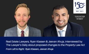 Real Estate lawyers, Ryan Klassen and Jeevan Ahuja were interviewed for this piece and share their thoughts. Read the article to learn more: B.C.’s move to bring in cooling-off period ‘remarkable consumer protection,’ lawyer says – The Lawyer’s Daily